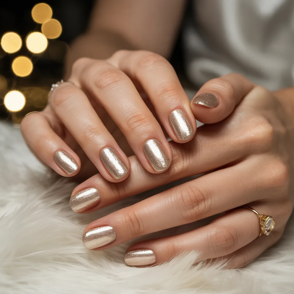 Soft champagne shimmer nails bring understated luxury. Perfect for dinners, office parties, or date nights — this tone complements any outfit with effortless glam.