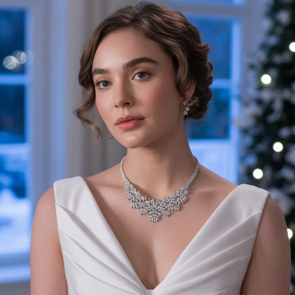The ultimate winter-inspired showstopper — a diamond cluster necklace that sparkles like morning frost. It flatters all necklines and skin tones, adding timeless luxury to every outfit. Pair it with sleek hair and soft makeup for pure winter glam.