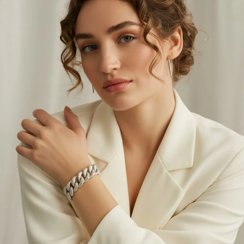 An icy-toned chain bracelet offers a balance of boldness and refinement. Perfect for layering with rings or cuffs, it adds instant shine to neutral coats and gloves. Ideal for modern women embracing minimal elegance.