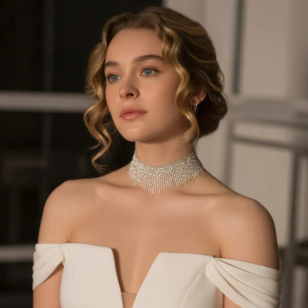 A crystal choker embodies the icy brilliance of the season. Ideal for evening events, it pairs beautifully with off-shoulder tops or sleek turtlenecks. Its frosted charm flatters long necks and instantly elevates any winter outfit.