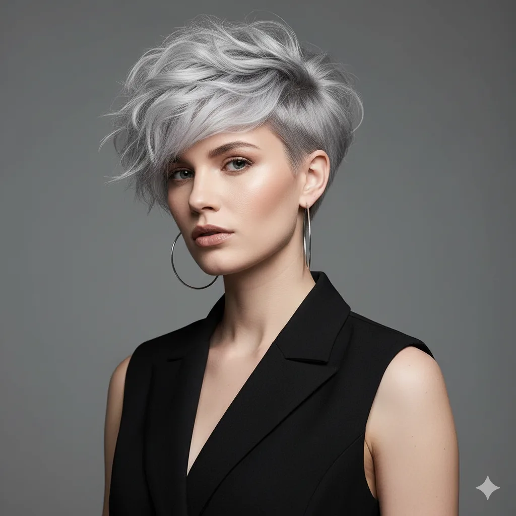 Not quite a pixie, not quite a bob — this cut delivers structure with softness. Great for fine hair that needs definition. Works for confident women who love short, daring styles without going ultra-short. A styling paste helps define those choppy ends perfectly.