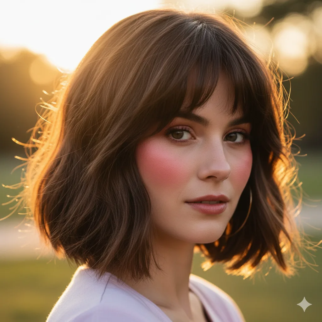 Add a soft fringe to your choppy bob to bring back that retro ‘70s charm. Curtain bangs frame the face, enhancing cheekbones and eyes. Great for heart and oval faces — style with a round brush for natural lift and volume.