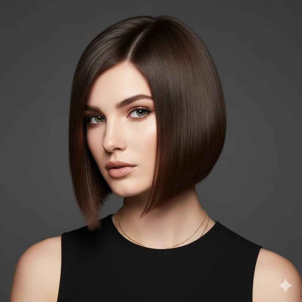 For women who love sophistication with edge, the A-line bob (shorter in back, longer in front) sculpts the jawline beautifully. Perfect for straight fine hair, it offers a sharp, modern silhouette. Ideal for office-to-evening transitions — simply add shine serum for that polished glow.