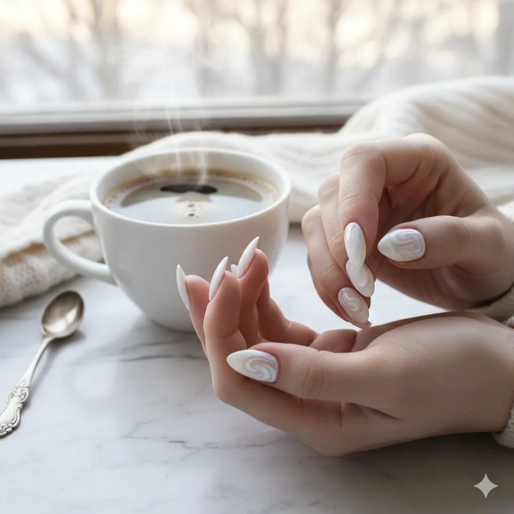 For a luxurious yet artistic vibe, white marble nails bring texture and elegance together. Subtle grey veining gives depth while maintaining a clean, modern aesthetic that complements minimalist winter wardrobes.