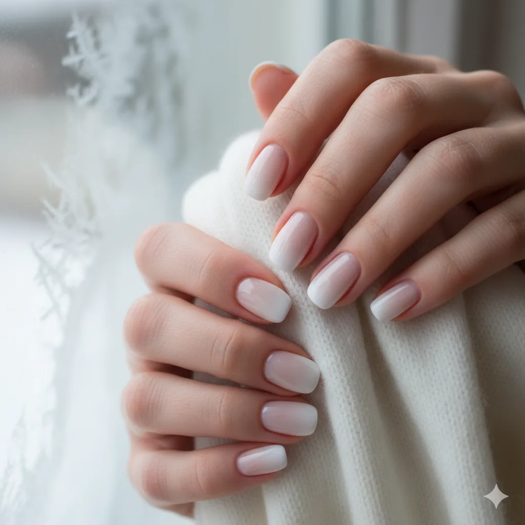 A modern ombre take on French nails—white fading into translucent nude. This soft, frosty gradient adds dimension and looks graceful on all skin tones, perfect for every winter outing.