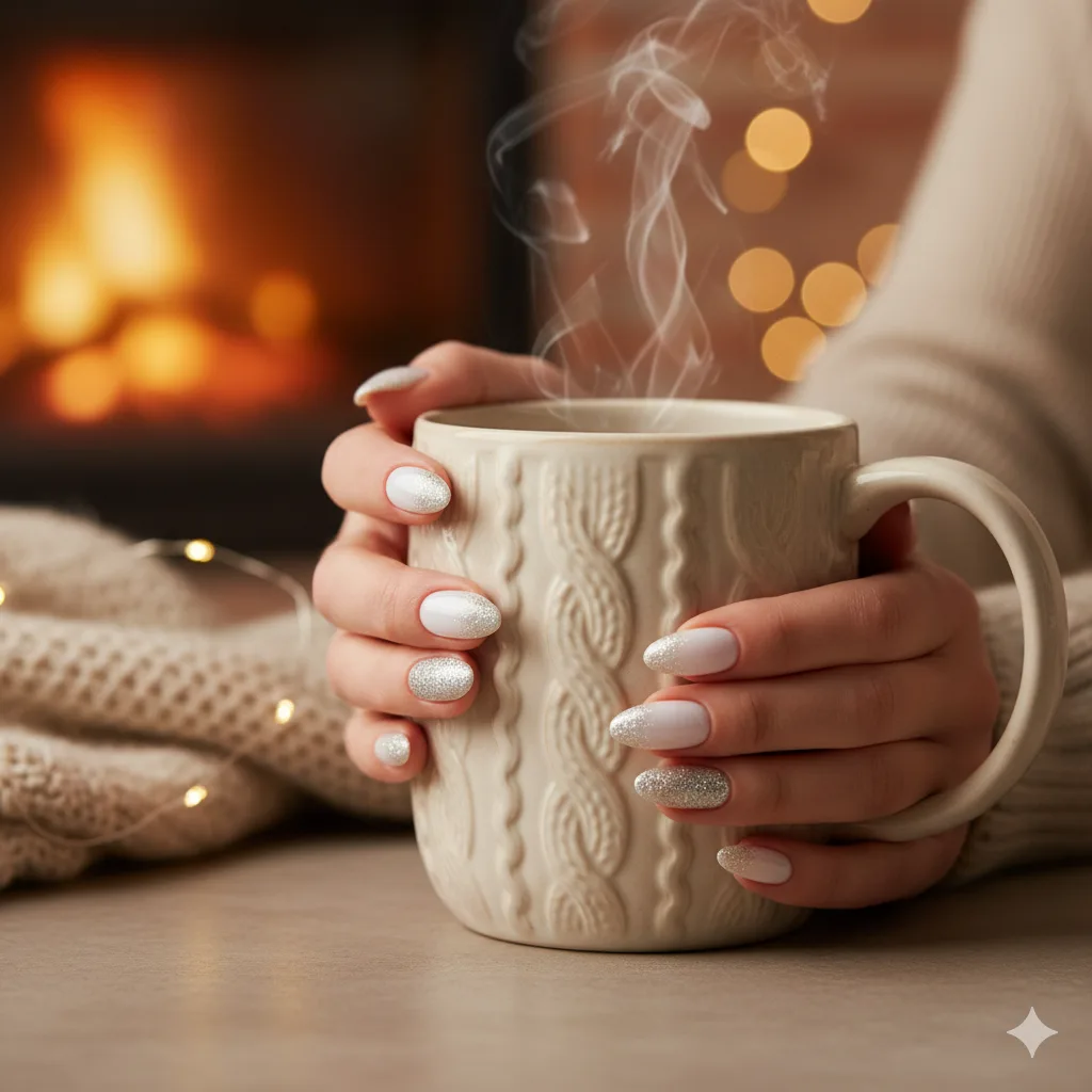 The ultimate winter glam—sparkling white nails that resemble crushed ice. Perfect for holiday parties or date nights, this high-shine style is all about confidence and celebration.