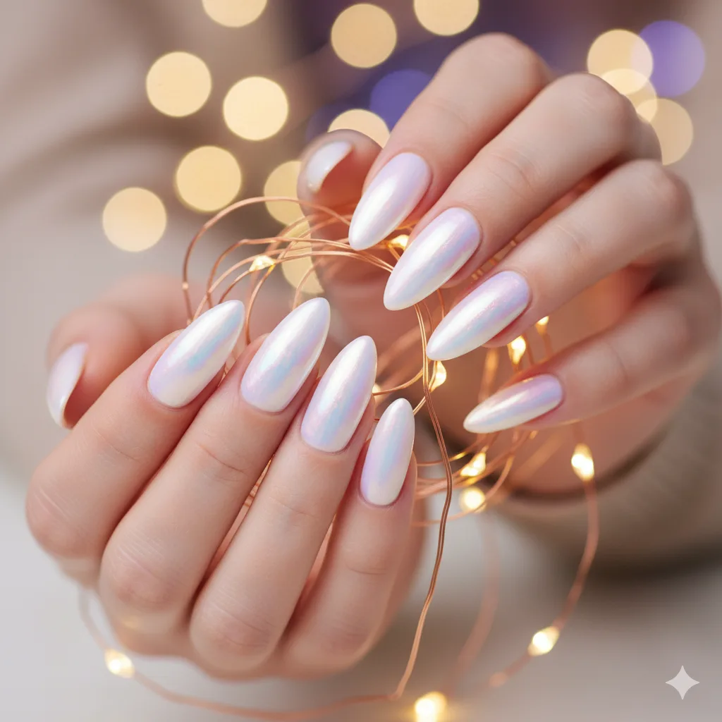 Inspired by the Northern Lights, this design uses iridescent shimmer over white polish. It’s ideal for night events, where light reflections make your nails glow with subtle color shifts.