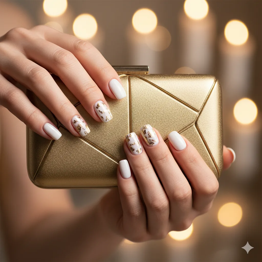 A rich blend of warmth and frost, white nails accented with gold foil bring sophistication and a hint of opulence. Perfect for evening gatherings or elegant winter weddings.